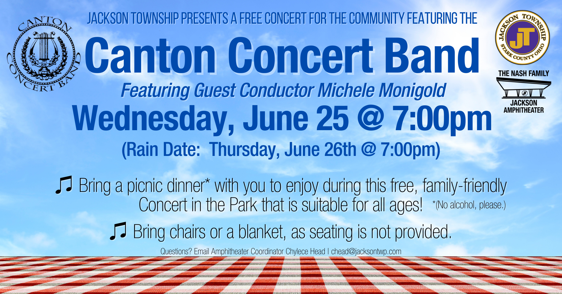 Nash Family Jackson Amphitheater 7454 Community Pkwy NW, Massillon, OH, United StatesPack a picnic dinner* and join us for a free, family-friendly evening with the Canton Concert Band at the Nash Family Jackson Amphitheater! Retired Jackson High School Director of Bands Michele Monigold will be featured guest conductor. Bring a chair, as seating is not provided. Jackson High School Band Students: This performance counts as one…